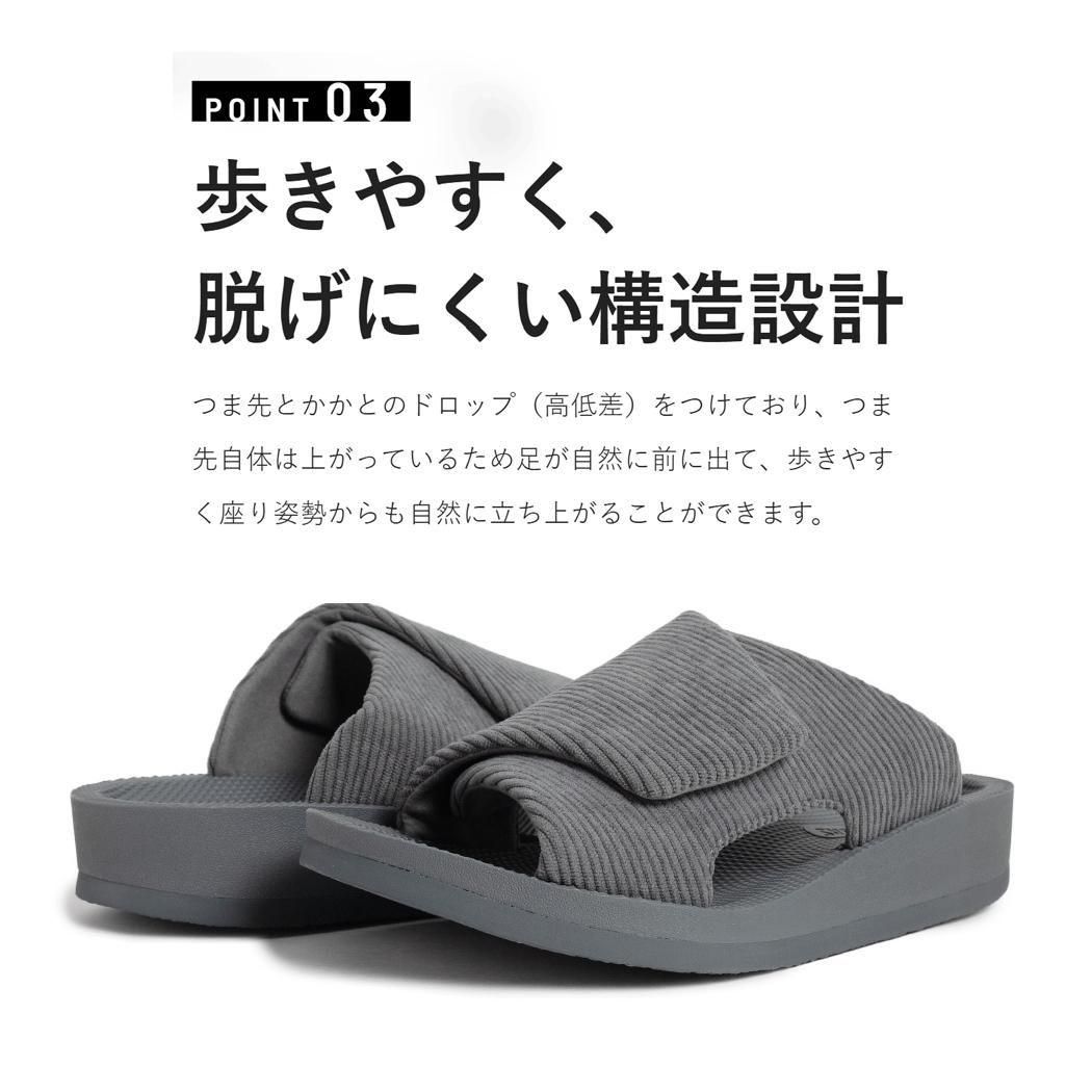 凹凸のグリップ底で滑りにくく改良され、暖かみのある柔らかいコーデュロイ素材で室内でも軽やかに快適な履き心地を実現。